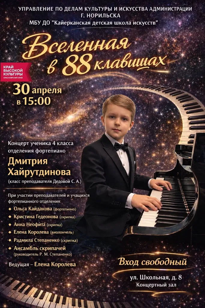🎹 «Вселенная в 88 клавишах» 🎶30 апреля в 15:00 в концертном зале состоится концерт ученика 4 класса фортепианного отделения Дмитрия Хайрутдинова (класс преподавателя Дедовой С.А.).